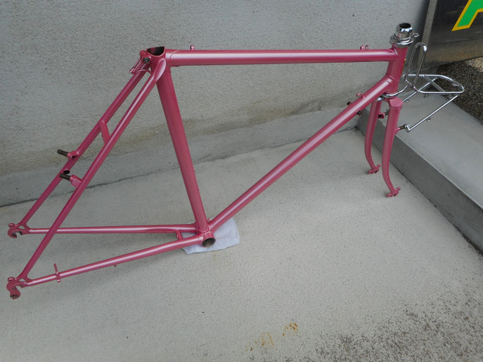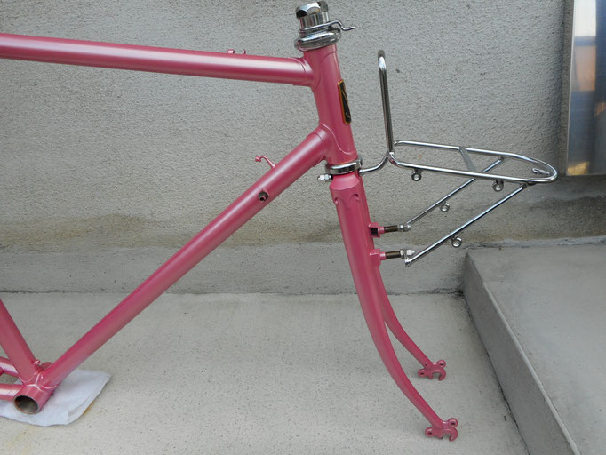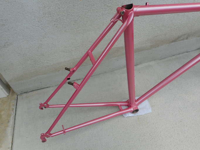 ユーズド品で小傷はありますがパールピンクが綺麗なフレームです。各部の工作から今は無き三木製作所製のフレームと思われます。Rエンド幅が130ですので10速にも対応できます。